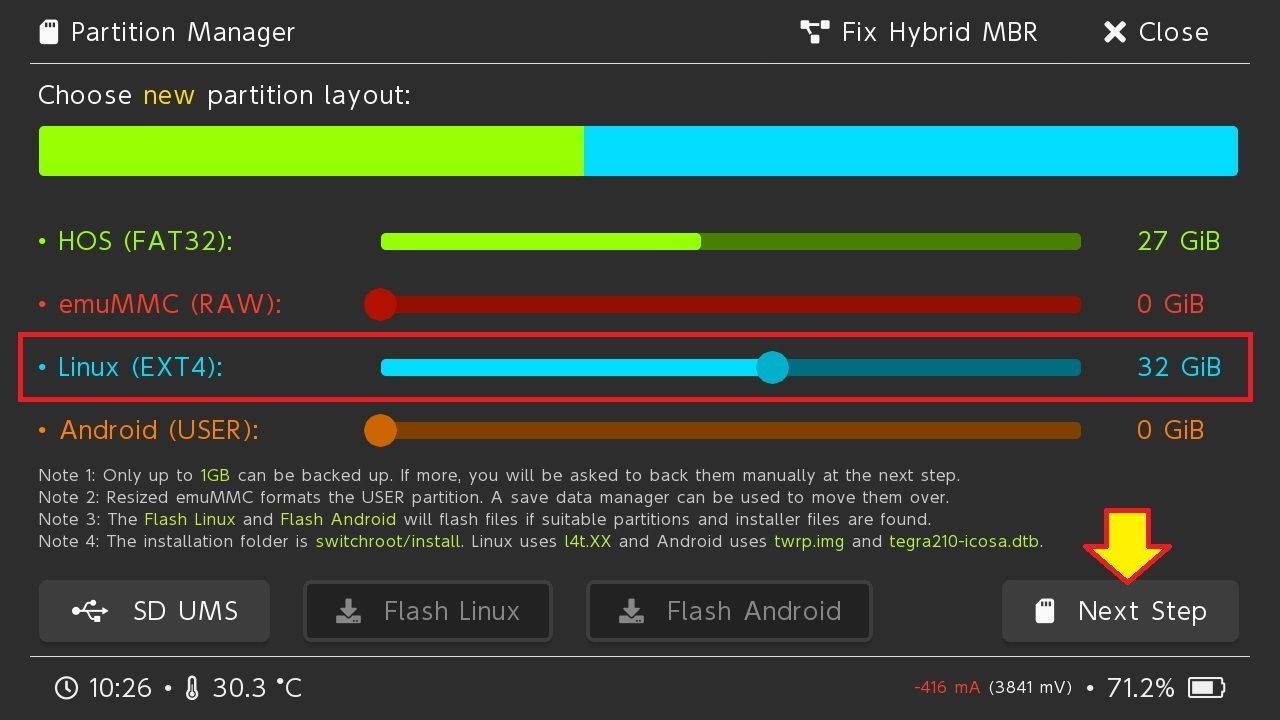 Per fare ciò, spostare liberamente il terzo slider verso destra, quello azzurro indicato con Linux (EXT4), in modo tale da assegnare una dimensione a piacere alla partizione.