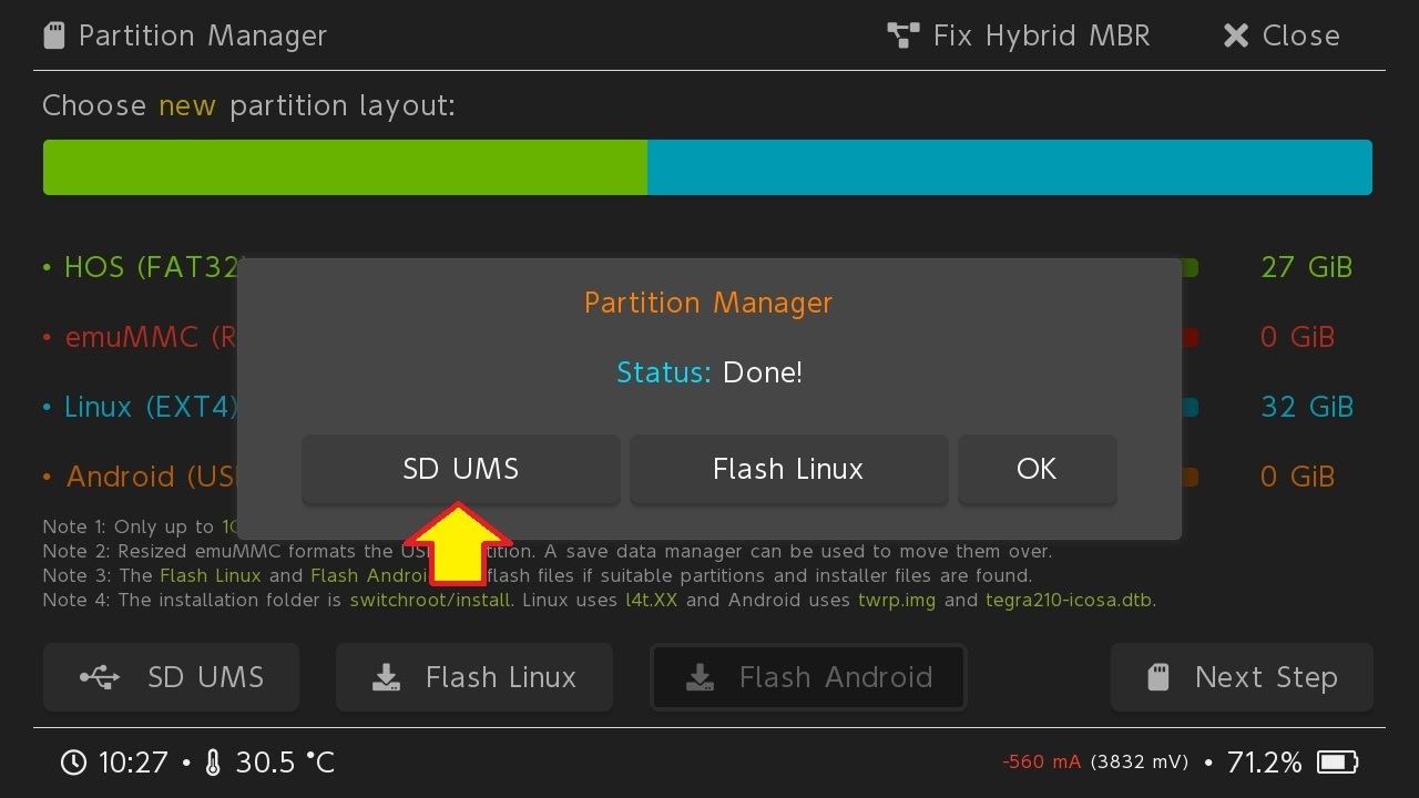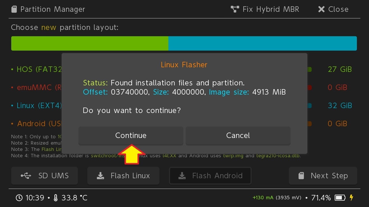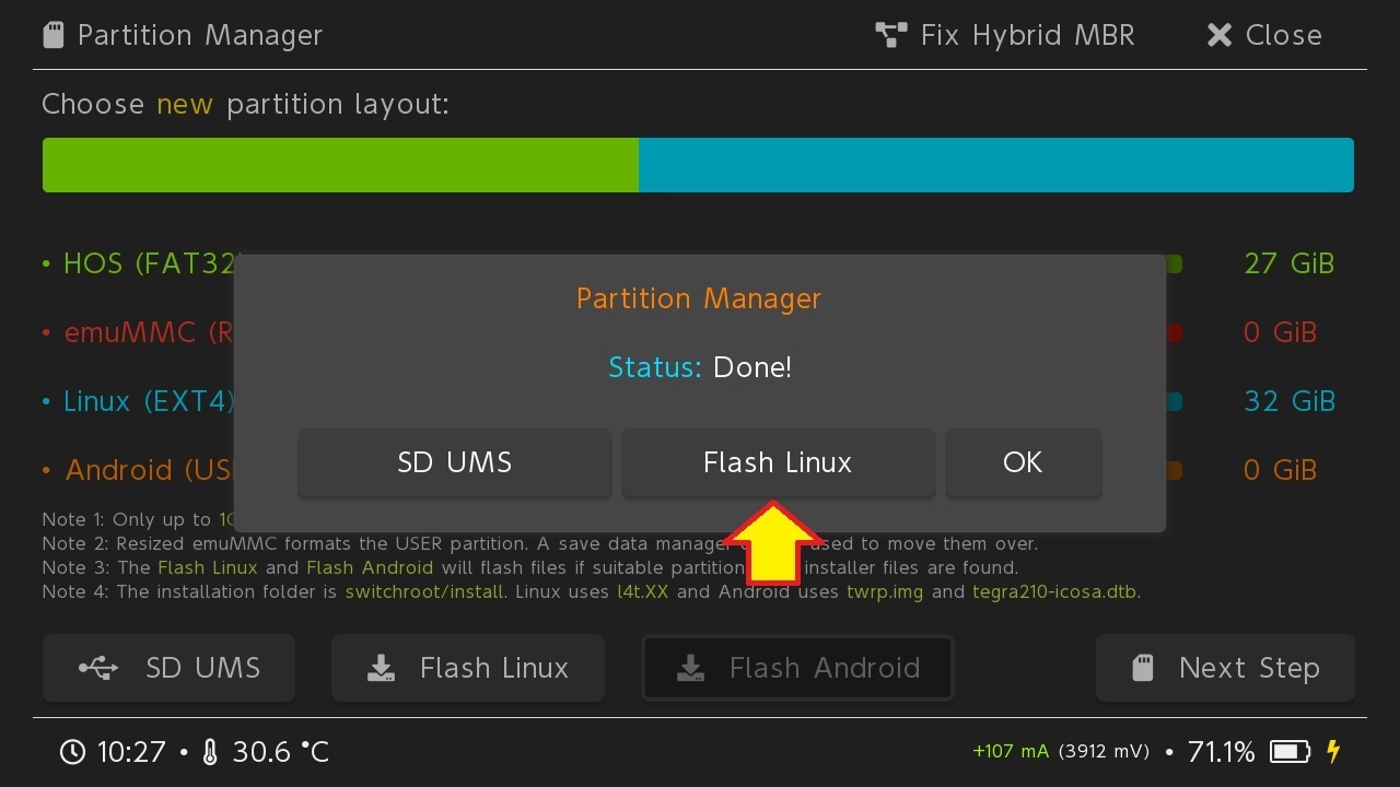 Fatto ciò, espellere in maniera sicura la microSD (in versione USB), selezionare Close su hekate non appena possibile e infine scegliere Flash Linux.