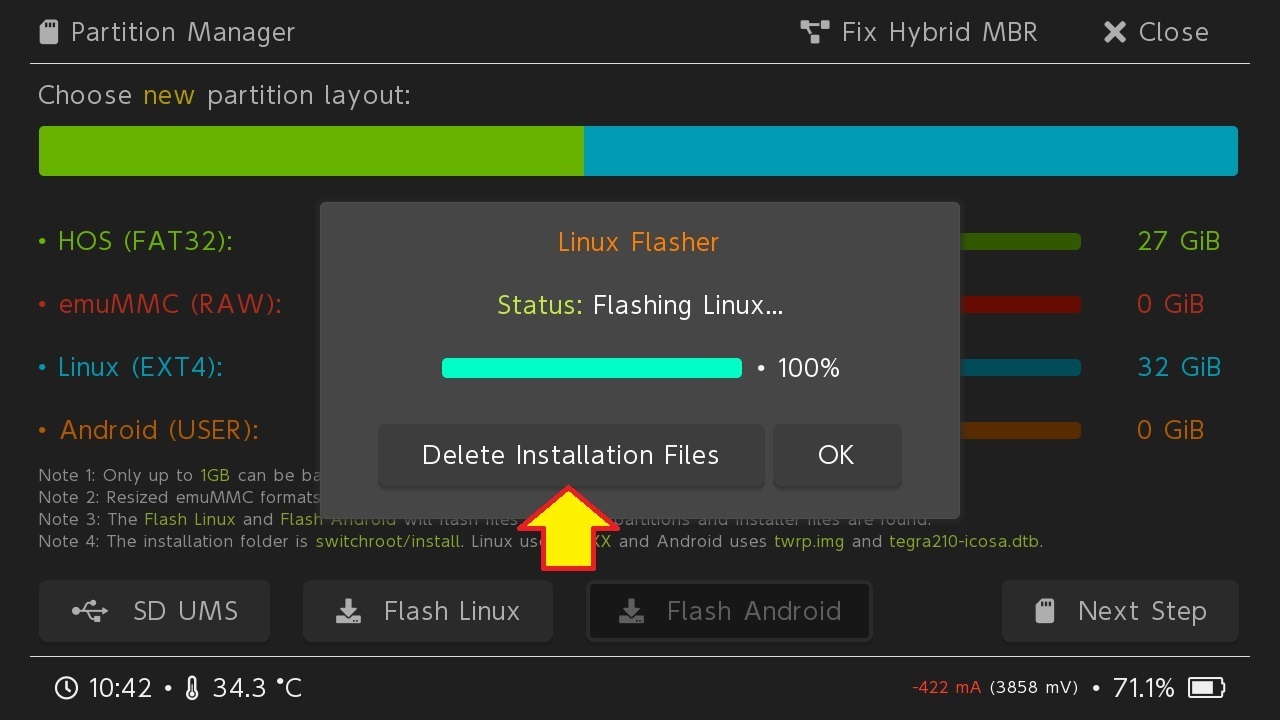 Finito il processo, selezionare Delete Installation Files per cancellare i file di installazione, liberando così diverso spazio dalla microSD.