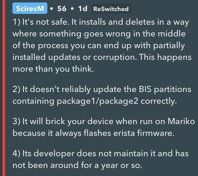 A partire dalla versione 0.14.0 di Atmosphère, questo è il modo ufficiale e consigliato per aggiornare il firmware della console, senza la preoccupazione di rompere qualcosa.
