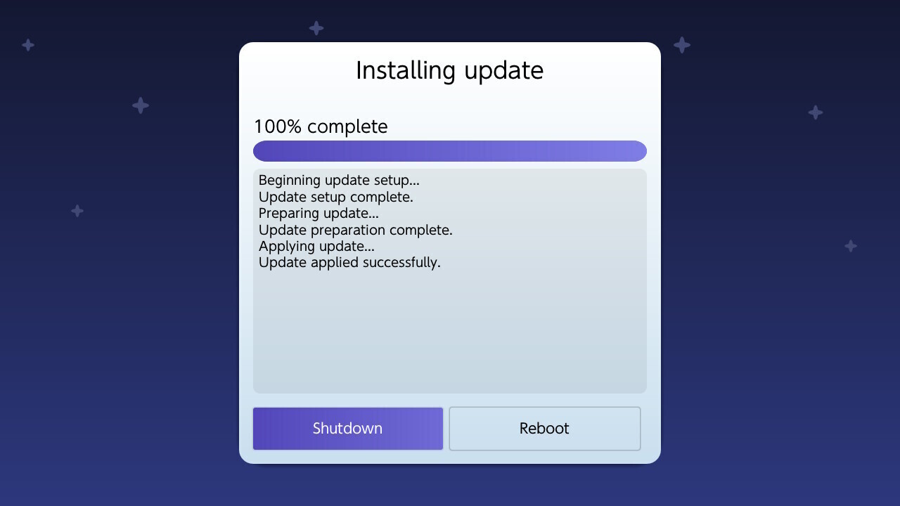 Una volta completato l'aggiornamento sarà visibile la scritta Update applied successfully e sarà possibile selezionare Shutdown now! per spegnere la console.