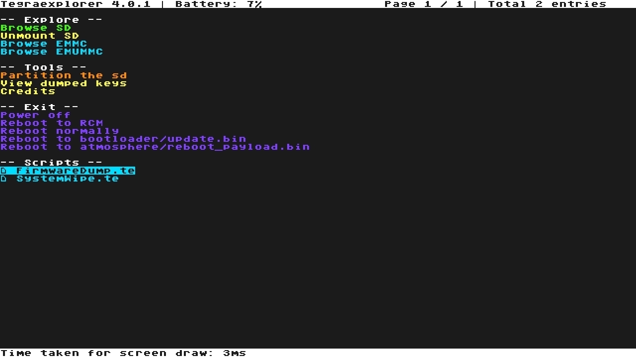 Fatto ciò, nella schermata di TegraExplorer, nella sezione -- Scripts --, selezionare la voce FirmwareDump.te.
