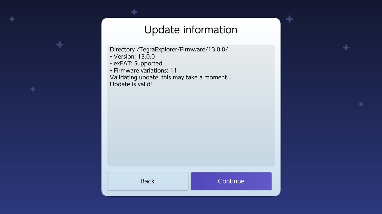 Dopo che l'homebrew effettua un controllo sui file, se non è stato trovato alcun errore apparirà la scritta Update is valid! e sarà possibile continuare con l'aggiornamento selezionando Continue.
