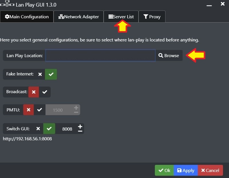 Specificare la cartella dove si trova switch-lan-play attraverso la prima voce delle impostazioni, Lan Play Location.